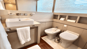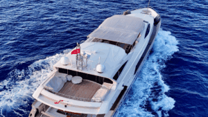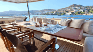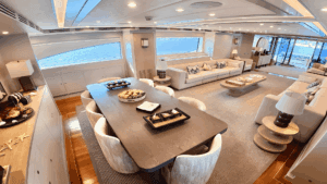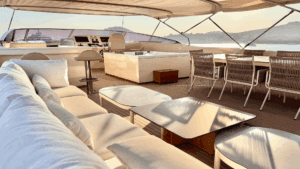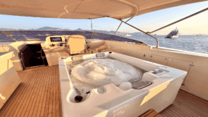 Bu yatın en dikkat çekici özelliklerinden biri, üst güvertesinde (flybridge) yer alan jakuzisi. Gün boyu güneşlendikten sonra jakuzide serinleyebilir veya gün batımına karşı içeceğinizi yudumlayabilirsiniz. Geniş yemek masaları hem açık havada hem de kapalı alanda keyifli akşam yemekleri için ideal. Ayrıca su altı aydınlatmaları sayesinde gece denizin üzerinde büyüleyici bir atmosfer yaratıyor.