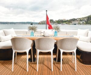 ÖNE ÇIKAN ÖZELLİKLER 2 JAKUZİ (Flybridge & Ön güverte) Panoramik cam tavanlı 1 master kabin Büyüleyici bir zarafete sahip 2 VIP kabin 2 Misafir kabini Salon Bar 5 ayrı yemek alanı Yüzme platformu Geniş güneşlenme alanı Çeşitli su oyuncakları Teknik olarak çok iyi donanımlı Dünyanın en iyi tasarımcılarının hayal gücünden doğan bu model, markanın ilk başyapıtıdır. Yüzlerce kişi, dünyanın dört bir yanından bu proje için bir araya geldi. Yıllar süren işbirliğinin ardından, proje gerçeğe dönüştü. Suyun üzerinde gerçek bir mücevher olan bu model, estetik, tasarım ve teknolojiyi bir araya getirerek misafirlerine aradıkları huzuru ve lüksü sunuyor. Dış mekanlar, jakuziler, Spa'lar ve dinlenme salonları ile olağanüstü bir rahatlama sunar. Gece yarısı yüzme, parlak güneşin altında tembellik ve keyifli anlar için tam zamanı: Jet ski platformu, akşam yemeği için masa yerleştirmek için kullanılabilir. Eşsiz bir yerde, denizde rüya gibi bir ortam yaşayabilirsiniz. 3 lüks süit, Master kabin ve VIP süitte 10 konuğu ağırlayabilir ve prenslere layık hizmetlerden yararlanabilirsiniz. Geniş ve seçkin ana güvertedeki MASTER oda, olağanüstü hizmetler sunmaktadır. En üst düzey modelin en iyilerini, büyüleyici bir cazibeyle bir araya getirir. Füme aynalı kitaplık ve muhteşem ahşap tavan ile yansıtılan olağanüstü zarafeti, sizi denizlerin ve okyanusların ötesine, hayal edilemeyecek bir konforla taşıyacaktır. Büyüleyici bir zarafetle aydınlık olan alt güvertedeki VIP süit, gerçek bir huzur cenneti olarak tasarlanmıştır. Yumuşak halı, entegre televizyonlu büyük ayna, banyoda daha fazla alan için muhteşem katlanabilir tuvalet masası...Bu lüks detaylar, rahatlama ve keyif için birer davettir. Bu süit, konukların rahatlığı ve konforu için özel olarak tasarlanmıştır. Her alanda merkezi veri sisteminin keyfini çıkarın ve filmlerinizi, videolarınızı, fotoğraflarınızı ekleyin. Kullanımı kolay e-medya sistemi, uzaktan kumanda veya her türlü akıllı telefonla yönetilebilir. Teknenin her odası ve süiti, her koşulda konforunuz için yenilikçi bir klima sistemi ile donatılmıştır. Gemide, daha fazla konfor için iki jakuzi keyfini çıkarın. İlk jakuzi, bardan birkaç adım uzaklıkta flybridge'de bulunmaktadır. 2,40 m çapındaki bu Spa 7 kişiye kadar oturabilme imkanı sunar. 28 hidromasaj jeti (yönlü, dönüşlü veya küvetin etrafına yerleştirilmiş nozullar) ve ısı ile şekillendirilmiş kaymaz koltuklarla donatılmış bir huzur cenneti. Isıtıcı, suyu sabit bir sıcaklıkta tutar. Spot ışıkları su altındadır. Sadece zevk ve keyif... Gelişmiş tedarik ödeneği (APA), kiralamanızın tedarik masraflarını karşılamak için önceden ödediğiniz ek ücrettir. APA, kiralama ücretine ek olarak ödenir. Gelişmiş tedarik ödeneğini, kaptanınız ve şefiniz için bir küçük nakit hesabı açmak gibi düşünmek yardımcı olabilir, çünkü bu, gemideyken kiralama masraflarını takip etmenin en basit yoludur. APA, yat kiralamanızın tüm günlük işletme masraflarını karşılar. Yiyecek ve yakıttan liman ve gümrük ücretlerine kadar her şeyi kapsar. Ayrıca, gemideyken olabilecek özel gereksinimlerinizi veya isteklerinizi de kapsar. Beklenebilecek ana maliyetler şunlardır: *Kiralama öncesinde, k size bir tercih formu gönderecek, böylece en sevdiğiniz yiyecek ve içecekleri talep edebileceksiniz. Bu form, APA tahmini hesaplamak için kullanılacaktır. *Yakıt maliyetleriniz seyahat programınıza ve seyir mi yoksa demirleme mi tercih ettiğinize bağlı olacaktır. Yakıt maliyetleri, kiralama süresince kullandığınız oyuncaklar ve botlar için de dahil edilecektir. *Liman ücretleri ve rıhtım maliyetleri de kiralamayı nerede ve ne zaman yapmak istediğinize bağlı olacaktır. Örneğin, Grand Prix haftasında Monako'da bir rıhtım için daha fazla ödeme yapmanız beklenebilir. *Kiralama süresince, tekne ve tüm ekipmanların temizliği, bakım ve onarımları da dahil olmak üzere tüm masraflar sizin sorumluluğunuzdadır. *Gemideyken interneti veya yatın uydu iletişimini kullanmayı planlıyorsanız, bu da APA'ya dahil edilecektir. *Bu her zaman geçerli değildir. Ancak, yatın normal limanı dışında gemiye biniyor veya gemiden iniyorsanız, teslimat ücreti ödemeniz gerekebilir. *Yatın çamaşır yıkama masrafları kiralama ücretine dahildir, ancak kişisel eşyalarınızı yıkatmak için ekstra ücret ödemeniz gerekebilir.